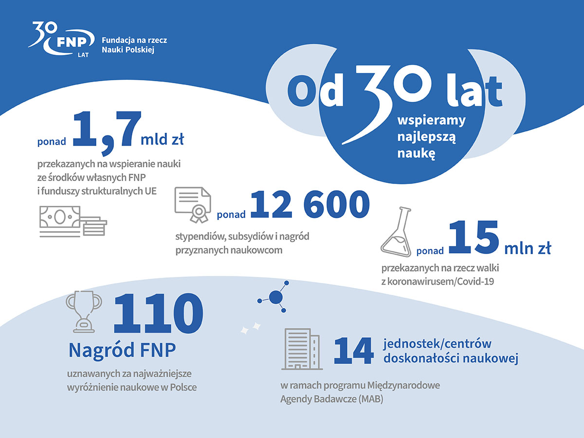 Fundacja na rzecz Nauki Polskiej, która jest największym, pozabudżetowym źródłem finansowania nauki w Polsce, działa już od ponad 30 lat. Przez ten czas Fundacja przeznaczyła na wspieranie nauki w Polsce ponad 1,7 mld zł, a liczba przyznanych stypendiów, subsydiów i nagród przekroczyła 12,5 tysiąca.